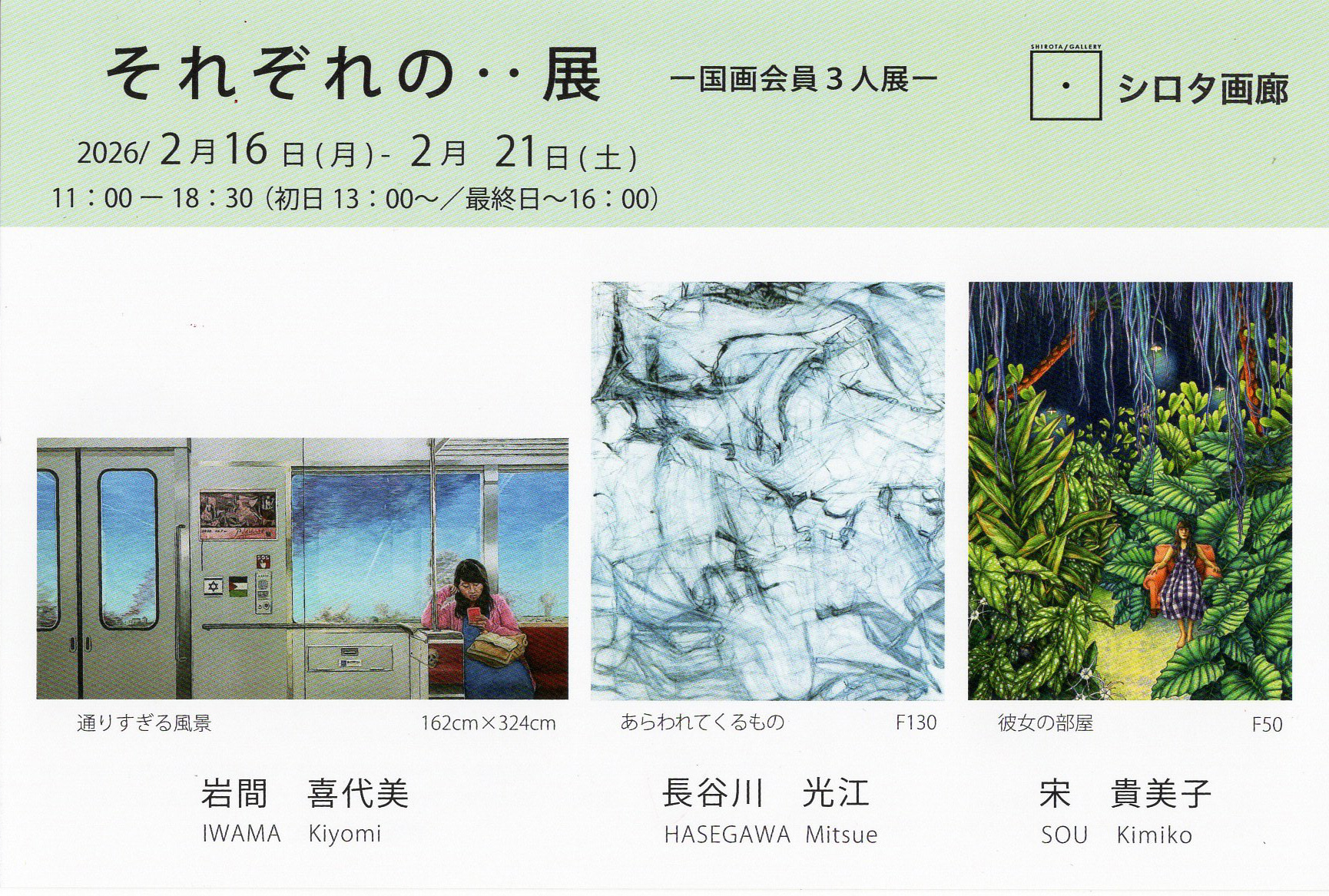 2026.02.01 それぞれの・・展 -国画会員3人展- 2026/ 2月16日(月)-2月21日(土) 11:00-18:30(初日13:00~/最終日~16:00) 岩間 喜代美 長谷川 光江 宋 貴美子 IWAMA Kiyomi HASEGAWA Mitsue SOU Kimiko