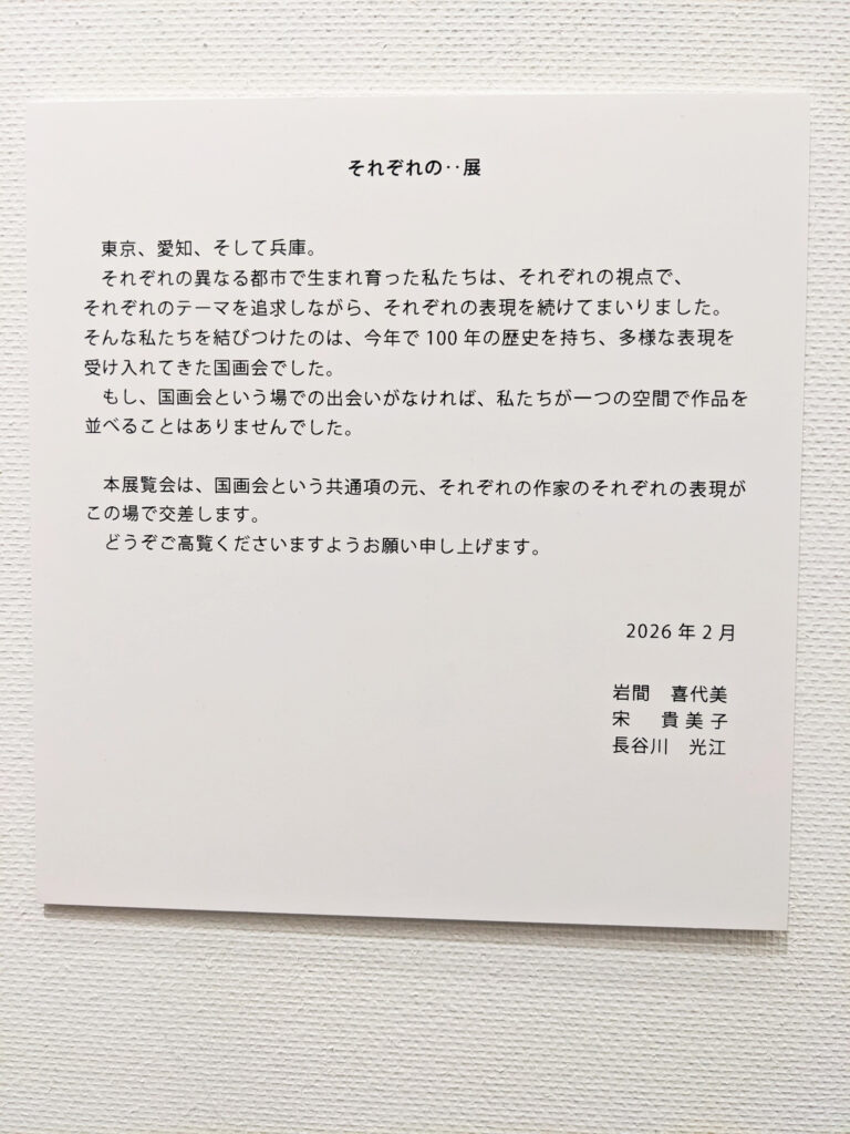 Room1 2026.02.01 それぞれの・・展 -国画会員3人展- 2026/ 2月16日(月)-2月21日(土) 11:00-18:30(初日13:00~/最終日~16:00) 岩間 喜代美 長谷川 光江 宋 貴美子 IWAMA Kiyomi HASEGAWA Mitsue SOU Kimiko 宋 貴美子 宋 貴美子 宋 貴美子 宋 貴美子 岩間 喜代美 岩間 喜代美 岩間 喜代美 長谷川 光江 長谷川 光江 長谷川 光江
